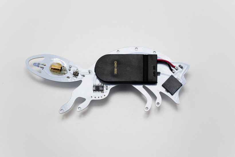揺れるとしっぽが光って音を奏でる、電子回路のアクセサリーです。